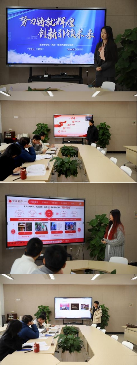 刘日胜、学工办李金伟、李承翼、竺梦婷老师、教学科蔡维雅老师;汇报人则是来自本院二、三年级的优秀学子,他们通过个人展示与现场答辩,全面展现了步青学子在学业成绩、综合素质和自我规划等方面的卓越风采。